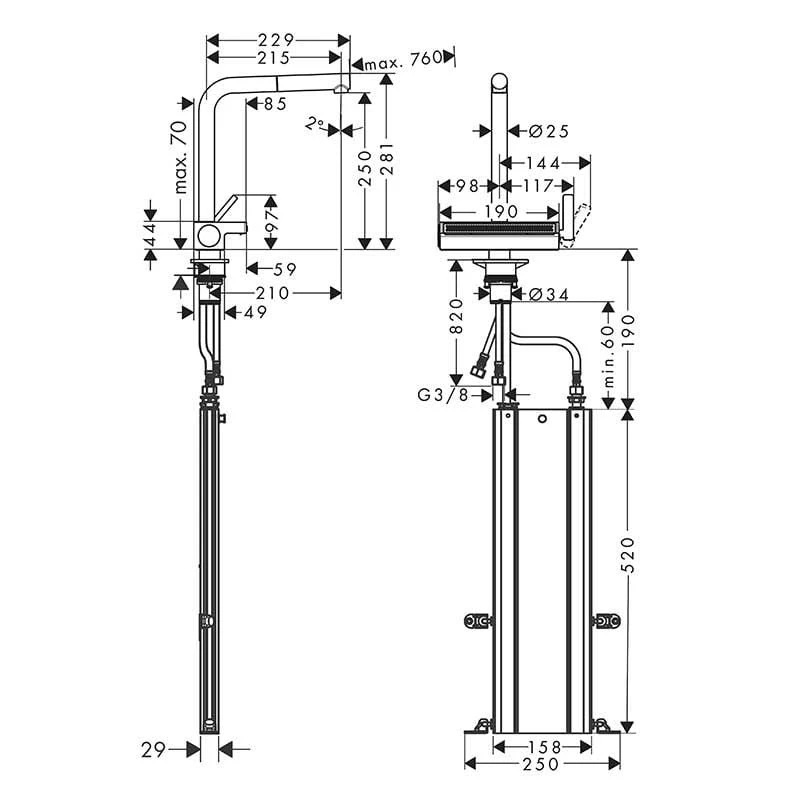 - Tap hole with Γ 35 mm required, Recommendation: the middle of tap hole drilling should be max. 50 mm from the back side of of the bowl