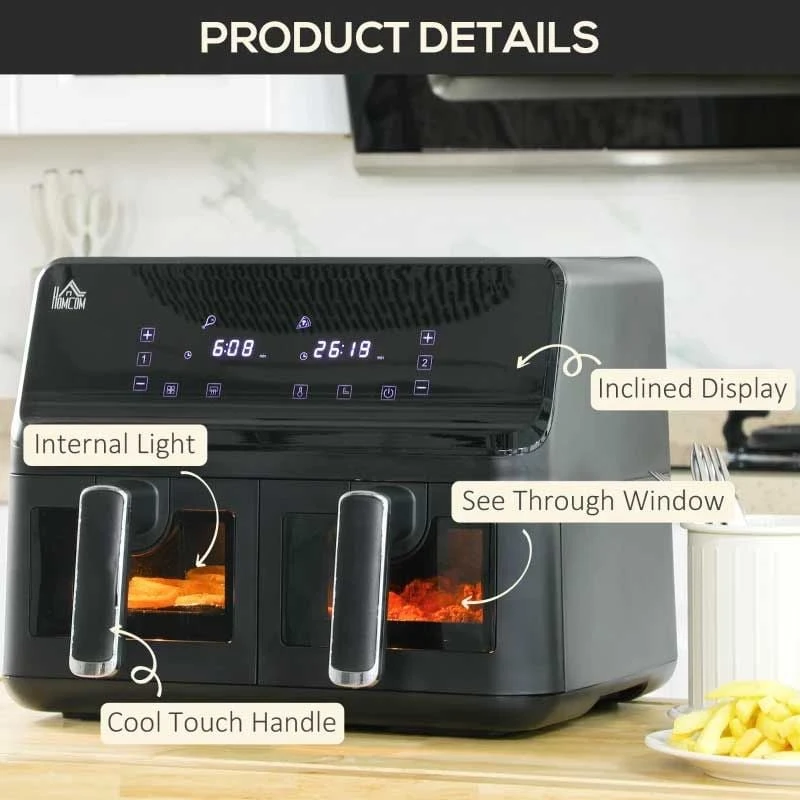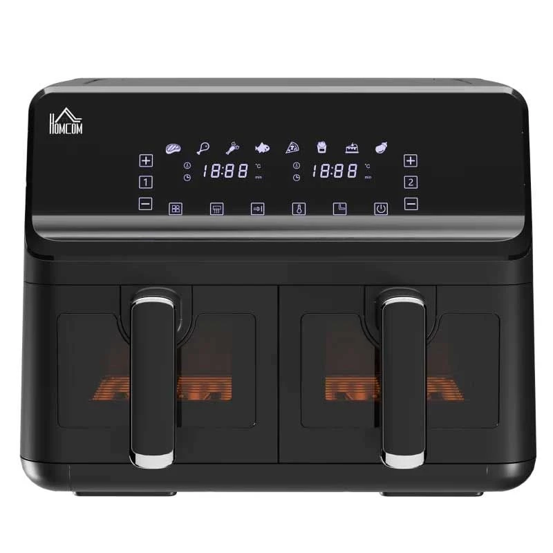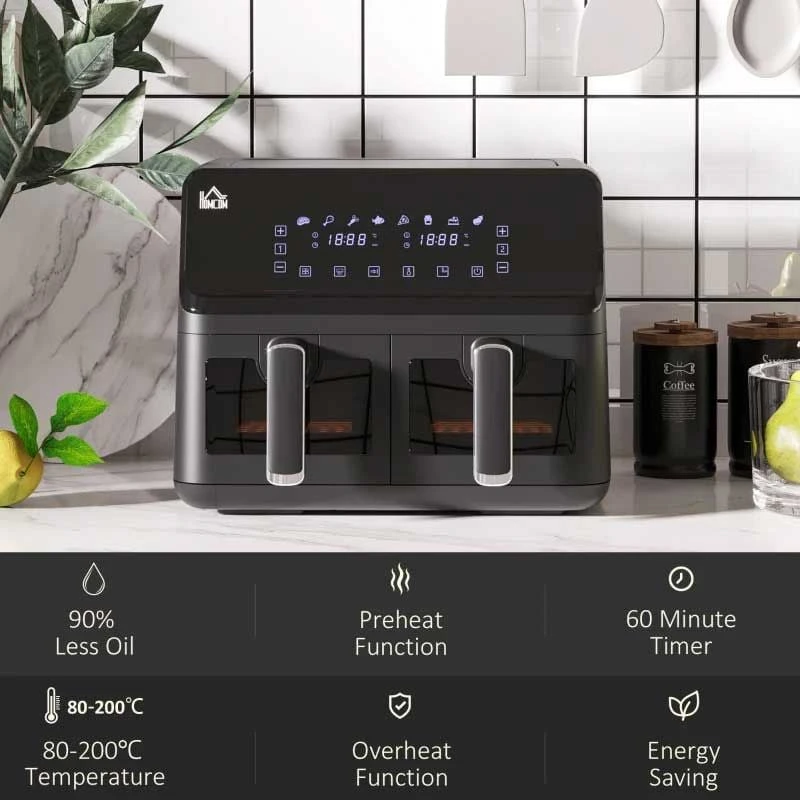 Double the delishness with this HOMCOM twin air fryer. With two separate cooking baskets, which can be individually controlled, you can cook two separate dishes at once – ideal for when you want to cook a full meal.