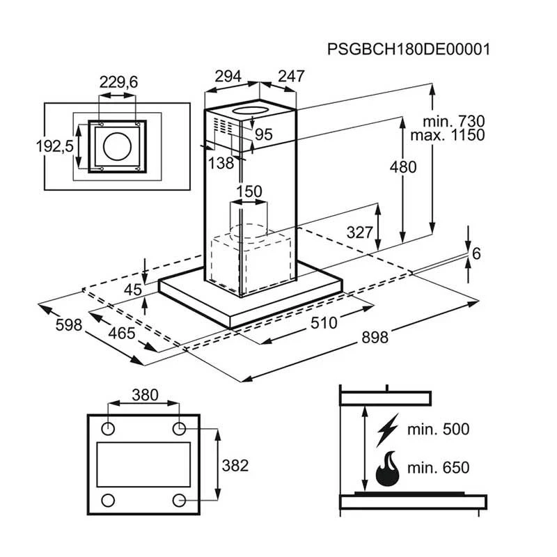 - Dimensions: H 730-1150 x W 898 x D 598mm